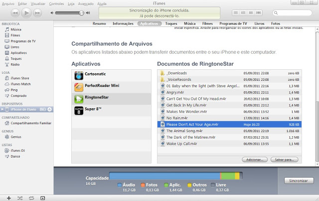 Clique no disquete para salvar. O arquivo será salvo diretamente no iPhone. Conecte-o ao PC e no iTunes vá na aba do seu celular e em aplicativos. Role a barra para baixo e aparecerá o aplicativo do Ringtone Star: