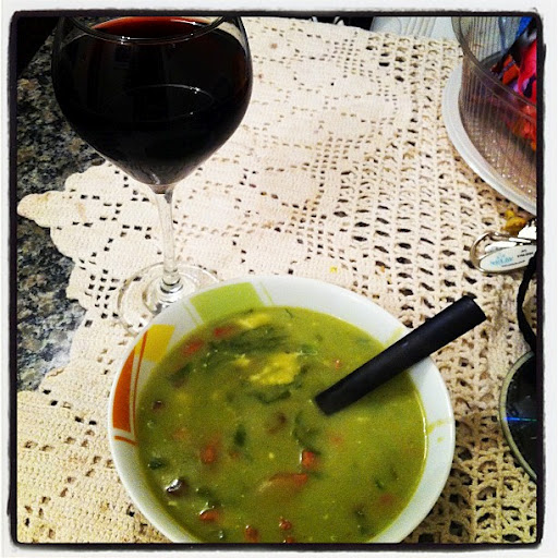 Corte a calabresa em cubinhos e refogue na margarina. Quando estiver tostadinha junte a couve e refogue até que ela murche. Misture a couve e a calabresa com o caldo batido e ferva mais um ou dois minutos.
