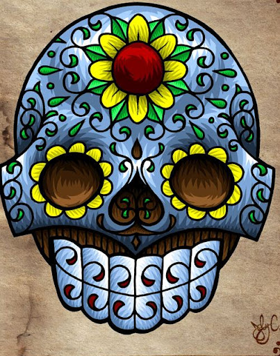 Aquelas caveirinhas alegres da morte, todas enfeitadas, floridas, sabe como? Então… caveiras estão na moda. Nas roupas, acessórios, móveis, tudo mais. Mas as mexicanas, alegres que só elas, surgem todos os anos nos dias de los muertos, dia 02 de novembro. Diferente do Brasil, os mexicanos comemoram o dia de finados com festa e alegria. E estas caveirinhas celebram e homenageiam os mortos.