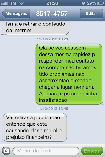 Ok, o Delta Dog Kennel me meteu a boca, dizendo que a reclamação era desnecessária, que me ofereceram prêmio de consolação, que não me expuseram pq comprei de outro (oi?), perguntando onde eu queria chegar ‘jogando o nome do canil na lama’ (dramáticos…) e mandando um SMS com “vc vai apagar a reclamação” (leve tom de ameaça detected).