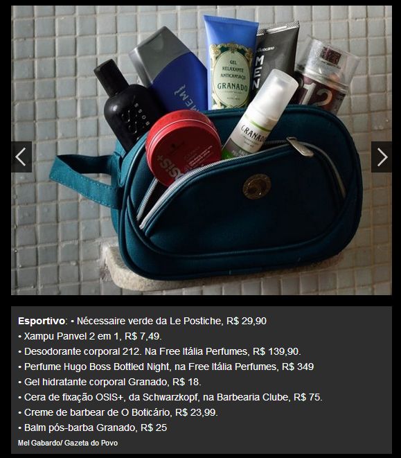 Agora os homens também se rendem ao item, pois perceberam que precisam mais do que apenas uma escova de dentes para sobreviver fora de casa. De acordo com a personal organizer Irene Cristina Loureiro, da Benfatto Organiza, o ideal é que o acessório masculino seja montado de acordo com as atividades do homem em questão, como trabalho, viagem ou malhação.