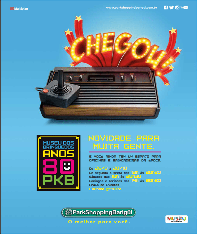 O ParkShoppingBarigüi traz para Curitiba a exposição ‘Brinquedos e Brincadeiras dos Anos 80’, uma atividade com muita interação para adultos e crianças relembrarem ou conhecerem mais sobre os brinquedos mais famosos da década de 1980.