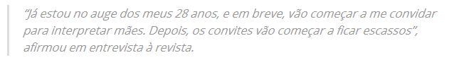 A bela afirmou que se preocupa com a chegada da idade e procura outros caminhos para sobreviver como atriz. “Eu tento me proteger disto trabalhando no teatro, produzindo”, falou.