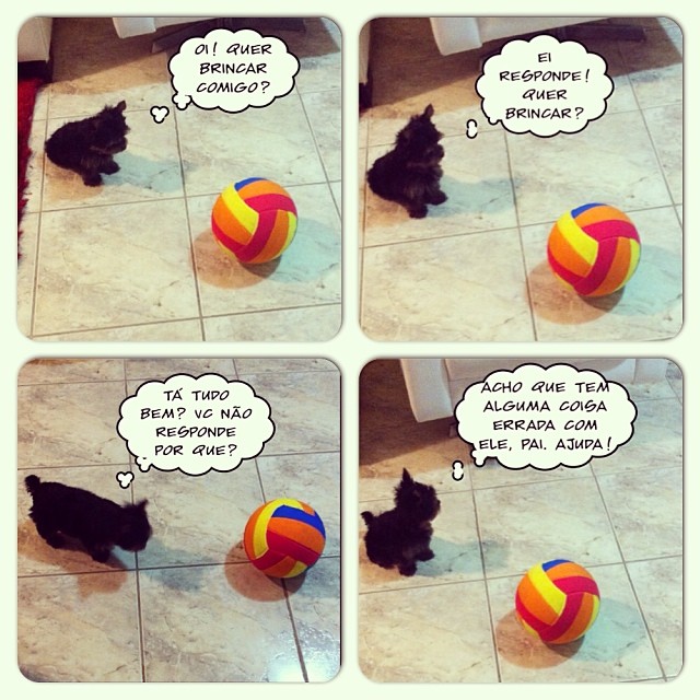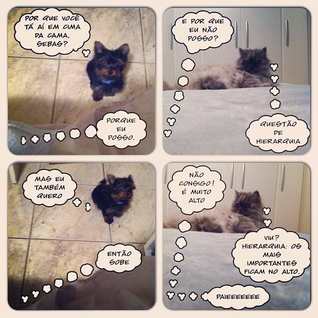 Foi então que os donos (eu incluso) viram ali uma ideia: de posse do iPhone e seus aplicativos, criaram pequenas HQs onde os dois contracenam com direito a falas e muita personalidade. Aos poucos os dois vão se entendendo e provando uma vez mais que gato e cachorro podem sim ser ótimos amigos.