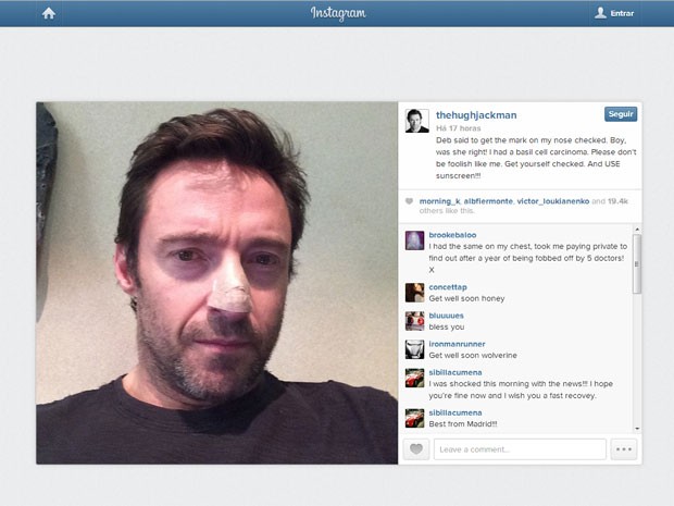 O ator australiano Hugh Jackman, conhecido por interpretar no cinema o personagem Wolverine, revelou nesta quinta-feira (21) que está em tratamento por causa de um carcinoma basocelular, câncer de pele muito comum em pessoas de pele clara. O intérprete de Wolverine postou no Instagram uma foto em que aparece com um curativo no nariz.