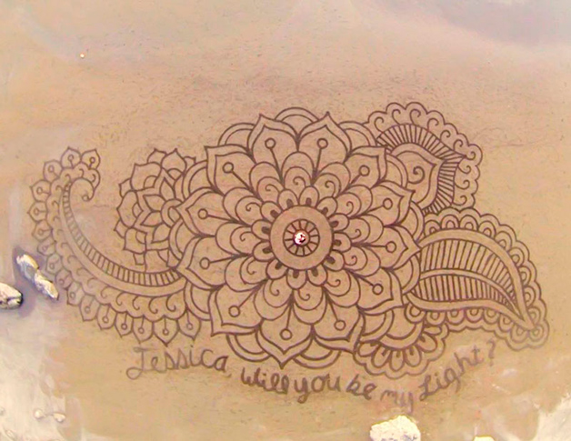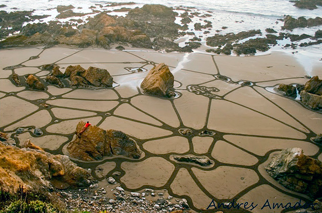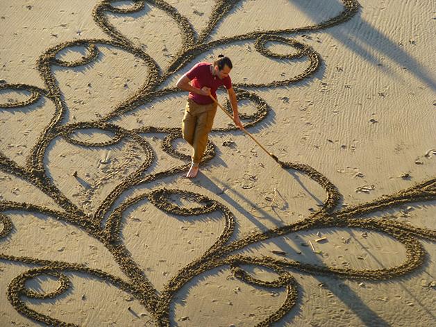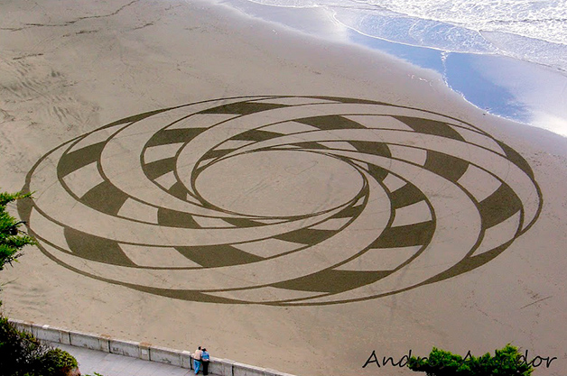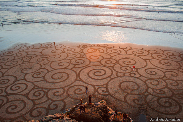 Andres Amador é um daqueles artistas que nos deixa com vergonha dos desenhos ou frases que fazemos na praia. Natural de São Francisco, Estados Unidos, ele cria obras na areia podem chegar aos 500 metros e incluem uma grande variedade de padrões e formas geométricas perfeitas.