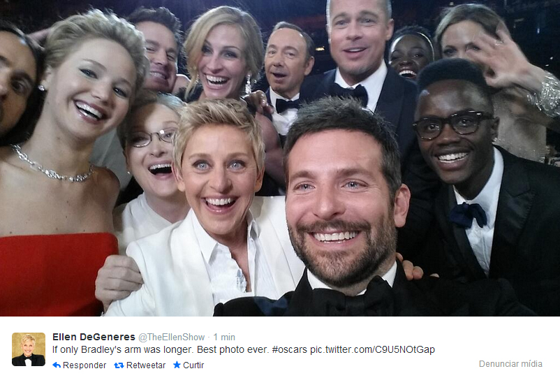 Até a uma da manhã desta segunda feira, a foto tirada por Ellen DeGeneres com os atores já tinha batido todos os recordes do twitter, derrubando o servidor e já tendo sido compartilhada mais de um milhão e trezentas mil vezes, segundo o site da Variety. A Academia de cinema não demorou a aproveitar a deixa e deixou um “desculpem, foi culpa nossa” no site. Depois de anunciar isso orgulhosa na festa, DeGeneres chama Goldie Hawn para apresentar o clipe dos últimos três indicados a melhor filme da noite: Philomena, Capitão Phillips e 12 Anos de Escravidão.