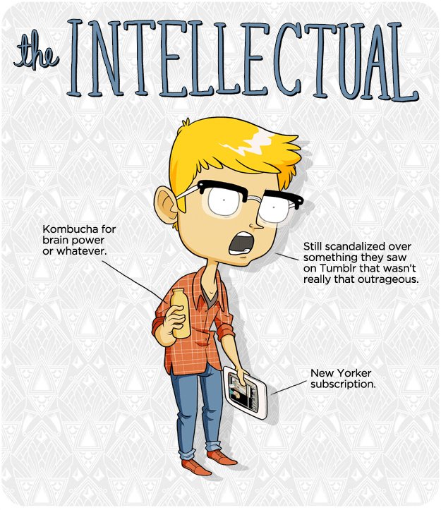 O Intelectual começa toda a frase com: “Então, você leu aquela coisa…” Ele pode ser do tipo que sabe tudo, e você pode contar com ele para resumir os fatos do dia em pequenas histórias que você pode então regurgitar no Facebook. O Intelectual lê todas as notícias e fica escandalizado por você (exceto quando bebe, que é quando se torna a pessoa menos politicamente correta que você já conheceu).