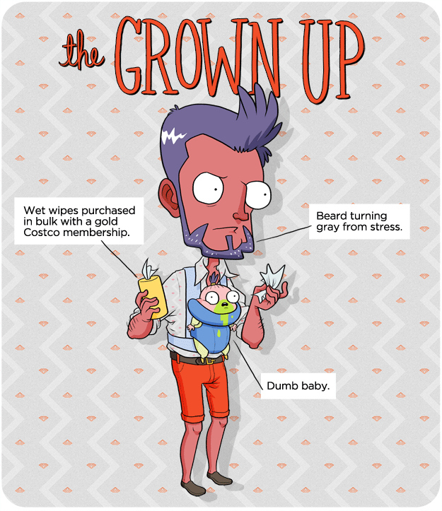 Em algum estágio dos seus vinte e poucos anos, um dos seus amigos vai se estabelecer e procriar, e é o início de algo mágico e edificante, mas também miseravelmente depressivo. O amigo Adulto faz você se sentir ao mesmo tempo aliviado por não estar amarrado e com uma criança, mas também apavorado por não estar com a vida decidida. O Adulto é um amigo legal para se ter porque você começa a sair com um bebê, mas você pode ir embora quando ele vomita em si mesmo.