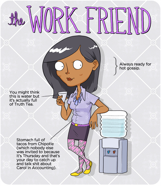 A Amiga do Trabalho é uma parte vital do ecossistema das amizades porque ela é a primeira pessoa com quem você fofoca na segunda-feira pela manhã e, normalmente, é a pessoa que você mais vê durante a semana. Ter uma melhor amiga no trabalho é crucial para passar o dia, e drinques após o trabalho ficam muito mais fáceis de organizar se a pessoa com quem você for beber estiver apenas a algumas mesas de distância.