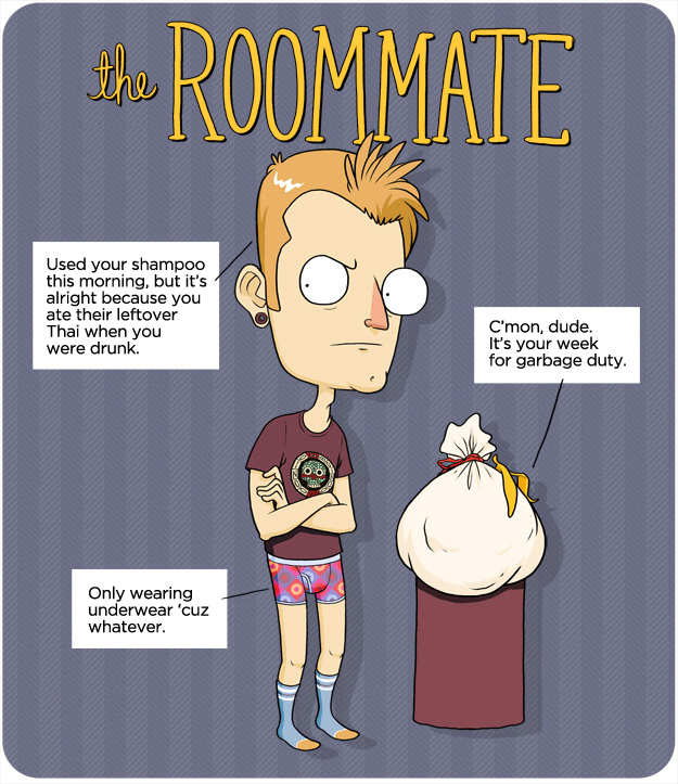 Em algum momento, você vai ter que escolher alguém para dividir uma casa, e todo mundo sabe que tentar morar com seu melhor amigo geralmente acaba em desastre. É por isso que você escolhe um amigo nota 8 pra transformá-lo no Colega de Quarto (não confundir com o filme de terror de 2011 de Minka Kelly/Leighton Meester). O Colega de Quarto é pouco responsável e limpo, mas também é flexível o bastante para participar de uma bebedeira inesperada numa terça-feira à noite que pode ou não acabar em uma discussão filosófica profunda sobre Cheetos. Apenas certifique-se de respeitar a rotatividade das tarefas da casa.