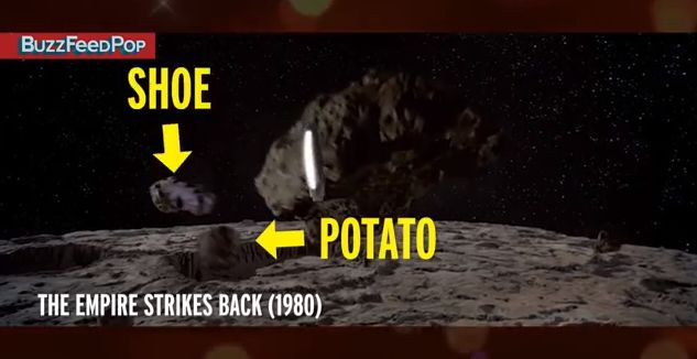 Esta cena num campo de asteroides contém objetos inusitados como uma batata e um sapato.