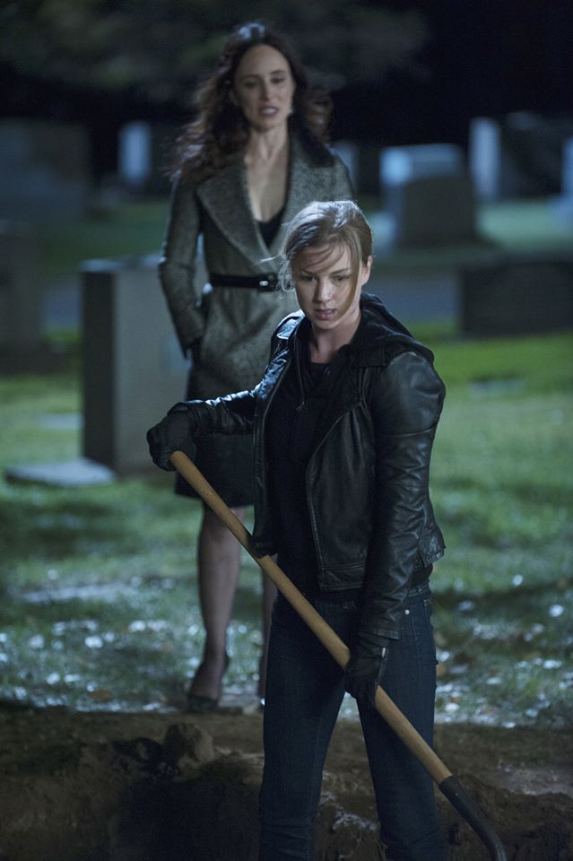 E a gente vai ao chão junto com ela, quando ao chegar em casa encontra o “presente” enviado por Victoria: o corpo inerte de Aiden no sofá. Já estamos chocados, estarrecidos, pasmos. Mas ainda não vimos nada. Se achamos que Victoria é capaz de um nível tão alto de maldade e de matar alguém só para que outra pessoa não seja feliz, esquecemos do que Emily é capaz. Não de matar, mas de coisas que podem ser muito piores. Tramando como só ela consegue, nossa vingadora loira se põe frente a frente com Victoria no cemitério enquanto cava a cova de Amanda. Depois de uma discussão acalorada, onde a matriarca afirma que sabe que a outra é, na verdade, Amanda Clarke, num gesto digno de aplausos (eu realmente aplaudi enquanto assistia), Emily acerta com a pá na cabeça de Victoria e a deixa desacordada.
