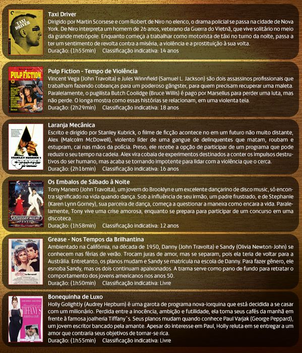 Também serão exibidos os longas Pulp Fiction, Laranja Mecânica, Os Embalos de Sábado À Noite, Grease e Bonequinha de Luxo. Veja abaixo os resumos de cada um disponibilizados pelo site da Cinemark: