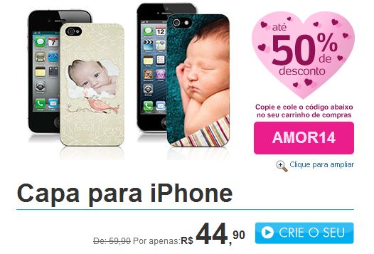 A Zoc Print também faz as capinhas personalizadas com vários modelos de layouts pré prontos que você só edita com seu texto ou imagens. O valor é de R$69,90. A vantagem desta é que foi a única que vi com capinha de borracha (as outras todas parecem ser do plástico rígido, que é difícil de tirar e às vezes quebra). Outra vantagem que não vi nos outros sites, é que a Zoc Print tem 35 páginas de layouts semi-prontos para você personalizar com fotos e textos, como molduras, camisetas de times onde você pode por seu próprio nome e coisas assim.