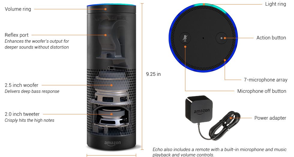 A Microsoft tem a Cortana, a Apple tem a Siri, mas ambas são somente aplicativos para celular. Agora a Amazon inova e lança o Echo, um equipamento em forma tubular, de cor preta, com cerca de 24 centímetros de altura, que tem uma coluna de som incorporada e reconhecimento de voz, que detecta a voz do utilizador mesmo numa sala com ruído de fundo. Através de sete microfones embutidos no topo do equipamento, o Echo utiliza uma tecnologia que permite ouvir o utilizador a partir de qualquer direção.