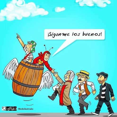 O cartunista venezuelano Eduardo Sanabria, conhecido como Edo, traduz a partida de Roberto Bolaños e seus personagens através de um desenho. Na imagem, Chaves e Chapolim, dentro do barril, ajudam Professor Chapatim, Chaparrón Bonaparte e Chómpiras a subir, todos criações de BolañosO cartunista venezuelano Eduardo Sanabria, conhecido como Edo, traduz a partida de Roberto Bolaños e seus personagens através de um desenho. Na imagem, Chaves, Chapolim, Professor Chapatim, Chaparrón Bonaparte e Chómpiras vão para o céu dentro do barrilO cartunista venezuelano Eduardo Sanabria retrata o encontro de Chapolim e Carlitos, personagem do ator Charles Chaplin, se encontram no céu. Roberto Bolaños e sua trupe do “Chaves” já haviam interpretado o personagem americano na década de 1980O cartunista Dave Alvarez publicou em seu Facebook a imagem do encontro entre Chaves e Seu Madruga. “Descanse em Paz, mestre Chesperito”. O desenho faz parte do vídeo “Corazón de Chavo” (Coração de Chaves) que o ilustrador fez em homenagem aos 85 anos de Roberto Bolaños . facebook: @dave.alvarez.maisonetA DC Comics México também homenageou o mestre Chespirito.O cartunista brasileiro Gilmar também prestou sua homenagem a Roberto Bolaños. No desenho, o personagem Chaves se despede de uma criança e pede para que ela não chore, mas é um homem adulto atrás que vai às lágrimasIlustração de Vicente Valentine (Pelo que consegui ler no desenho).