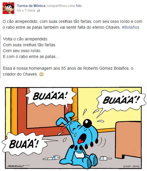Maurício de Souza publicou sua homenagem ao Chespirito na página da Turma da Mônica no Facebook.Criadores das tirinhas “Um sábado qualquer“, também fizeram sua homenagem. “Dicen que el almuerzo es una hora sagrada. Mientras comía el almuerzo, el tiempo de “El Chavo del Ocho” fue un momento sagrado. Bolaños encantado diferentes generaciones, llevando alegría a los hogares e inmortalizó personajes en la sonrisa de cada niño. Hoy en día, descansa junto a los dioses de la comedia, y este es mi homenaje a la Santa Bolaños, el santo del humor!”