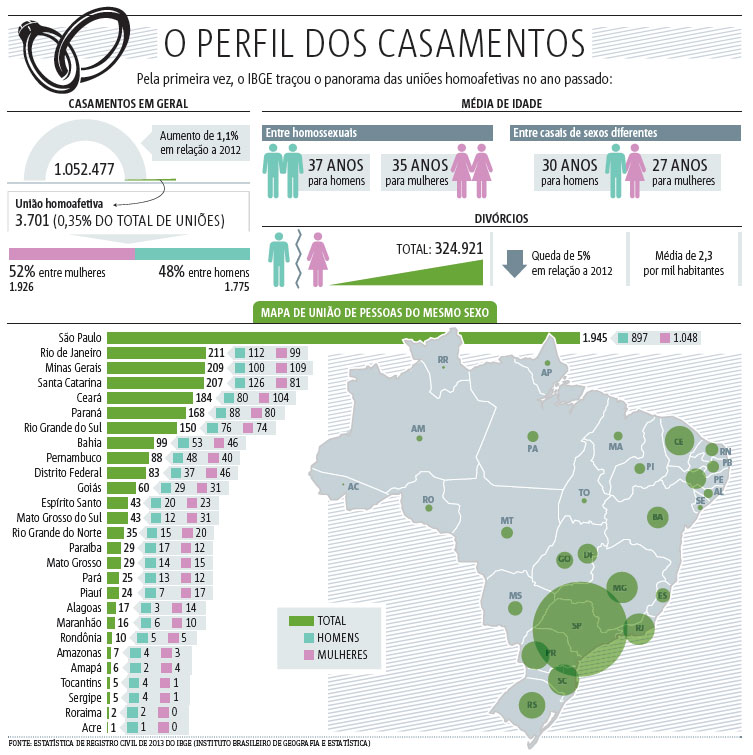 Pela primeira vez o órgão analisou casamentos homossexuais a partir de dados obtidos junto a cartórios de todo o país. De acordo com a pesquisa Estatísticas de Registro Civil 2013, divulgada nesta terça-feira, foram realizados no ano passado 3.701 casamentos civis entre pessoas do mesmo sexo no país, dos quais 52% entre mulheres (1.926) e 48% (1.775) entre homens. O IBGE não contabiliza registros de união estável.