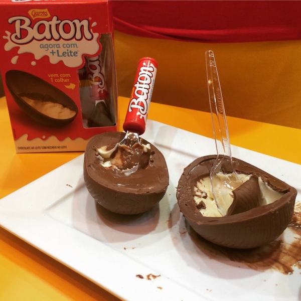 A Garoto quem matar a gente com a delícia do Batom de Colher, que reúne a combinação do chocolate Baton ao leite com recheio cremoso ao leite para ser consumido com colher.