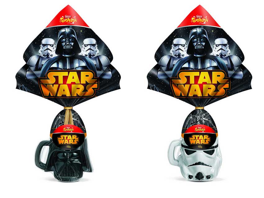 Já na Nestlé quer matar os fãs da saga de George Lucas e traz o ovo Star Wars, acompanhando o lançamento do 7º filme da série, que vem com uma caneca exclusiva em dois modelos: Darth Vader e Stormtrooper. Quem aposta que vai sumir rapidinho das prateleiras?