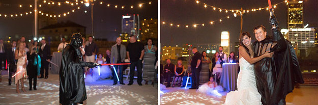 Acompanhados por Stormtroopers, com adereços como sabres de luz, daminhas à lá Princesa Leia e lugares marcados com os nomes dos lugares do filme o ápice da festa foi o pai da noiva, mas o todo foi espetacular! Lindo, nerd e elegante.