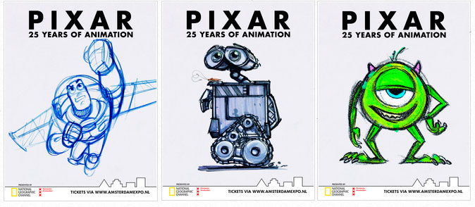 Nas exposições de outros países o que se viu foi uma grande quantidade de desenhos e esboços de diversos personagens e cenários que os fãs reconhecerão facilmente. Maquetes dos personagens idênticas aos que conhecemos e desenhos feitos à mão e coloridos também fazem parte. Também existem telas exibindo o progresso das animações digitais mostrando o processo de renderização, escolha de cores e texturas e outros aspectos técnicos e vídeos de making of. A exposição começou como “Pixar: 20 anos de Animação”, em Nova York em 2006. Em 2011 para comemorar os 25 anos, os estúdios atualizaram o conteúdo mostrado com arte de filmes recentes e outros arquivos antigos.