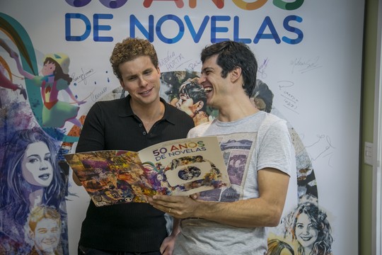 Entre as diversas gerações de atores, cerca de 300 foram retratados. “A cultura da telenovela está intimamente ligada à cultura do Brasil e participar dessa coletânea só pode ser uma honra! Meu filho vai vibrar, porque em uma das figurinhas está o Niko e o Félix. E ele ama o tio Mateus”, disse Thiago Fragoso (33) sobre Benjamin (4) ao recordar o casal de sucesso que viveu com Mateus Solano (34) em Amor à Vida (2013). “Nunca imaginei estar em uma publicação assim. Cheguei a colecionar o álbum que a Globo fez da novela Que Rei Sou Eu?”, emendou Mateus. No início do mês, ele ganhou o segundo herdeiro com Paula Braun (36), a quem deu o nome também de Benjamim. O casal é pai ainda de Flora (4). Para eternizar o momento, Thiago resolveu fazer uma selfie com o amigo, Dira Paes (45), que está entrando no quarto mês de gravidez, e o casal Flávia Alessandra (40) e Otaviano Costa(41). “A ideia desse álbum é genial para nós atores relembrarmos também. A gente emenda uma novela na outra e não tem tempo de fazer esse resgate. Chegou a hora!”, realçou Flávia.