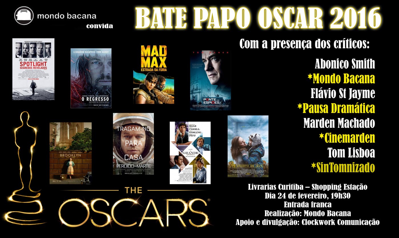 No próximo dia 24 de fevereiro Abonico Smith (Mondo Bacana), Flávio St Jayme (Pausa Dramática – que também promove um bolão do Oscar em sua página do facebook), Marden Machado (Cinemarden) e Tom Lisboa (SinTomnizado) se reúnem na Livraria Curitiba do Shopping Estação para conversar, opinar, dar palpites e responder perguntas dos fãs de cinema sobre os muitos filmes indicados nas diversas categorias do Oscar 2016.