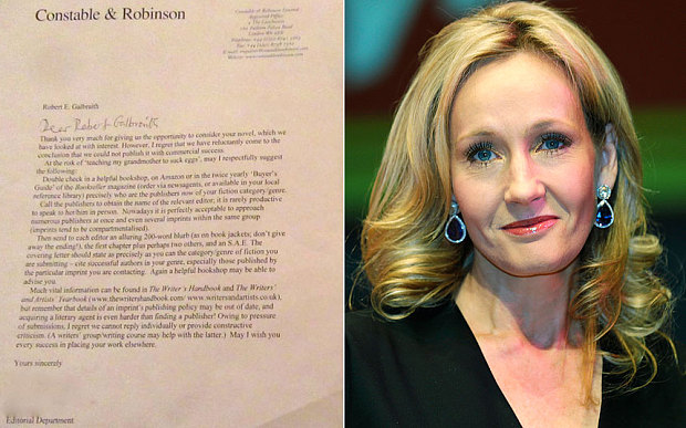 Nesta semana, JK Rowling divulgou algumas das cartas das editoras que rejeitaram suas publicações como Robert Galbraith. Em especial uma um tanto dolorosa da editora Constable & Robinson, a advertendo que seus livros adultos jamais poderiam ser comercialmente bem sucedidos.