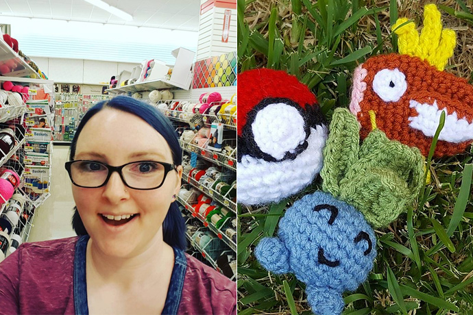 Os bichinhos de crochê são tão colecionáveis quanto os virtuais. Ela chama o projeto de #CrochetGo. Suas criações incluem versões de Tangela, Pikachu, Snorlax, Magicarp, Oddish e Jiggly Puff.