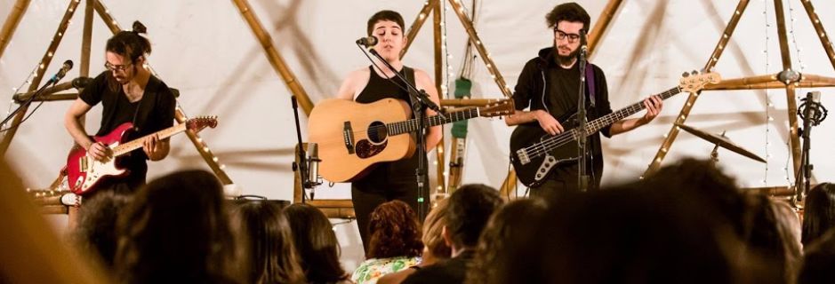 Na apresentação do Sofar Sounds Raquel Reis (voz e violão) é acompanhada de Zé Assumpção (baixo), Gabriel Migão (guitarra) e Marcos dos Santos (bateria).