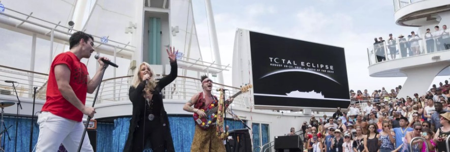 A cantora galesa de 66 anos aproveita a exposição do eclipse solar e marcou para esta segunda-feira (21) uma apresentação em um cruzeiro na Flórida. Ela cantou a música num navio no exato momento do eclipse, acompanhada da banda DNCE.