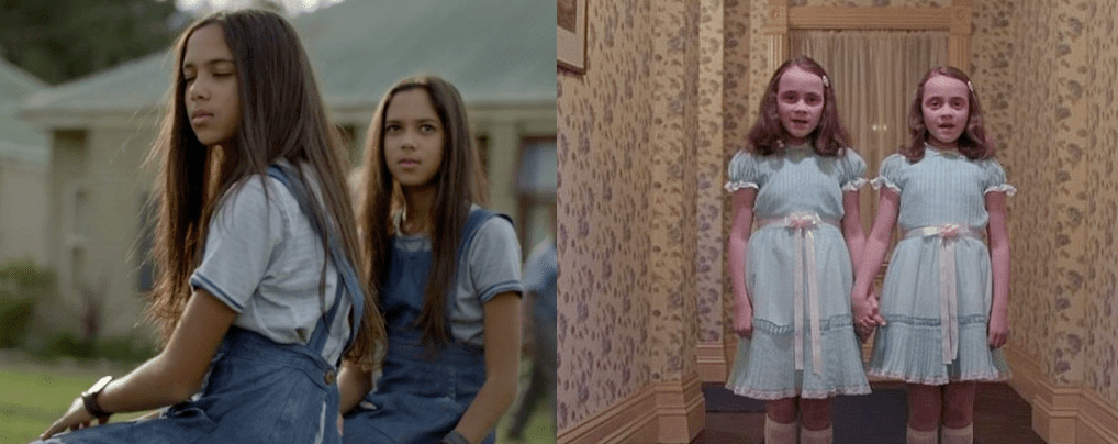 Também aparecem duas gêmeas em uma cena com a mesma roupa. Outra referência a O Iluminado.