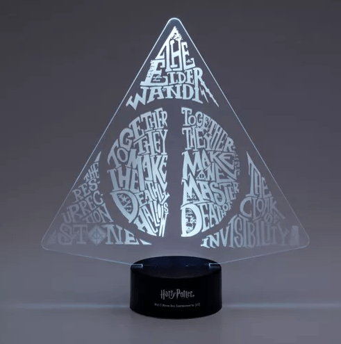 Já o outro item é uma luminária em acrílico com o simbolo das Relíquias da Morte linda e com as frases “The Elder Wand”, “The Resurrection Stone”, “The Cloak of Invisibility” , “Together they make the Death Hallows” e “Together they make one master of death”.