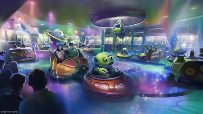 - Alien Swirling Saucers: Prepare-se para uma atração fora de série quando os simpáticos alienígenas verdes chegam em seus discos-voadores! Projetado como um conjunto de brinquedos que Andy ganhou do Pizza Planet, os visitantes vão girar em suas próprias naves ao efeito de sons, luzes e música enquanto o “Garra” se pendura por cima da sua cabeça.
