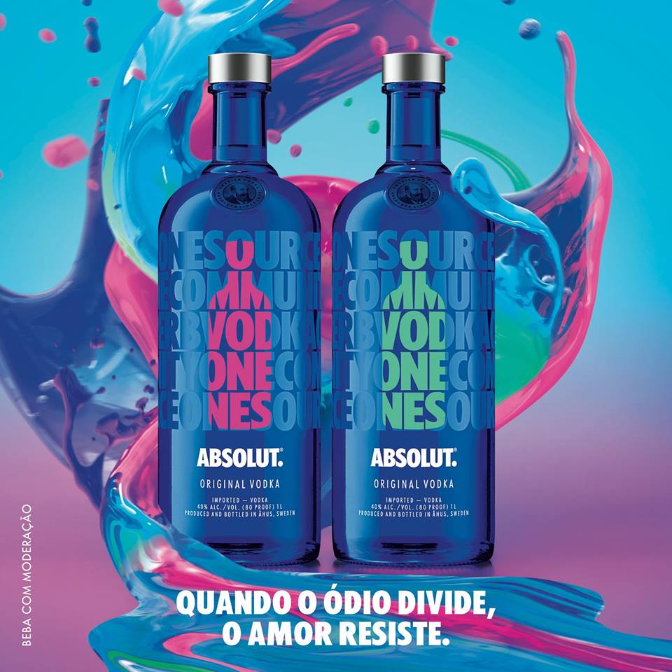 A Absolut postou esta semana em seu facebook o resultado da campanha #AmorResiste: os rótulos das novas edições da vodca foram impressos com tintas extraídas de cartazes de ódio ao redor do mundo.