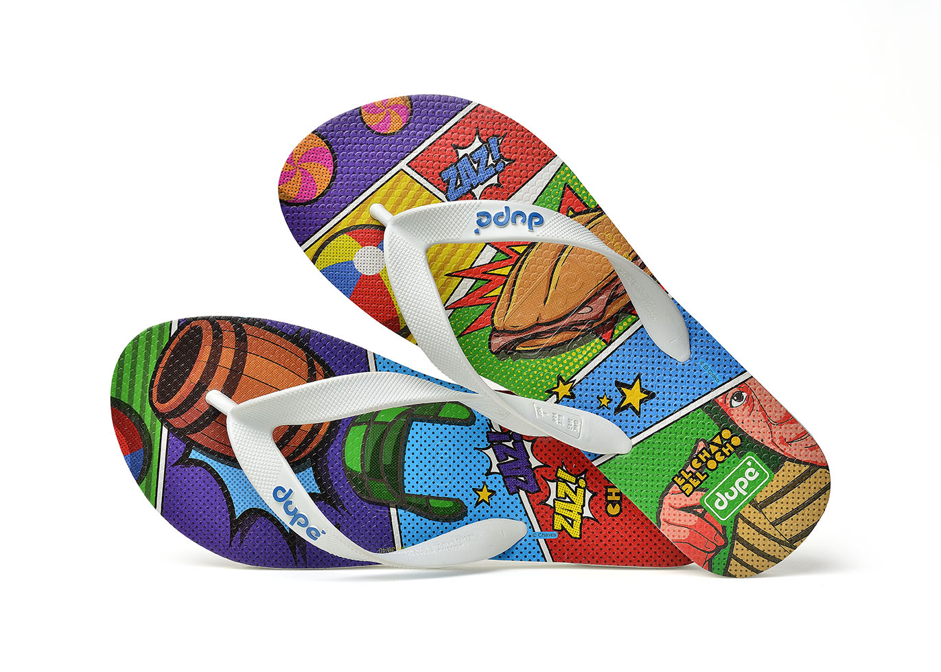 Com a qualidade conhecida de Dupé, marca da Alpargatas, as novidades produzidas em borracha trazem duas estampas que têm chancela do Grupo Chespirito: uma traz inspiração da pop-art, com cores vibrantes que remetem às vivências e ícones característicos do seriado Chaves, enquanto a outra traz uma releitura moderna dos personagens estilizados como emojis.