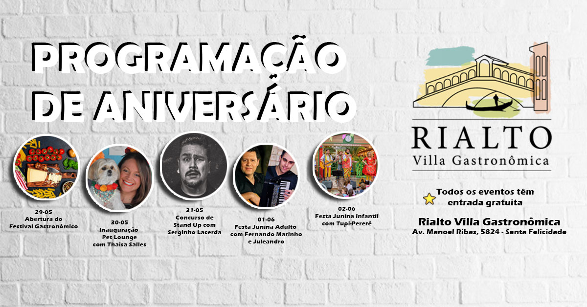 Os últimos dias de maio e o comecinho de junho serão movimentados em Santa Felicidade. A Rialto Villa Gastronômica está em festa, celebrando seu primeiro aniversário e traz cinco dias de comemoração com uma atração diferente a cada dia.