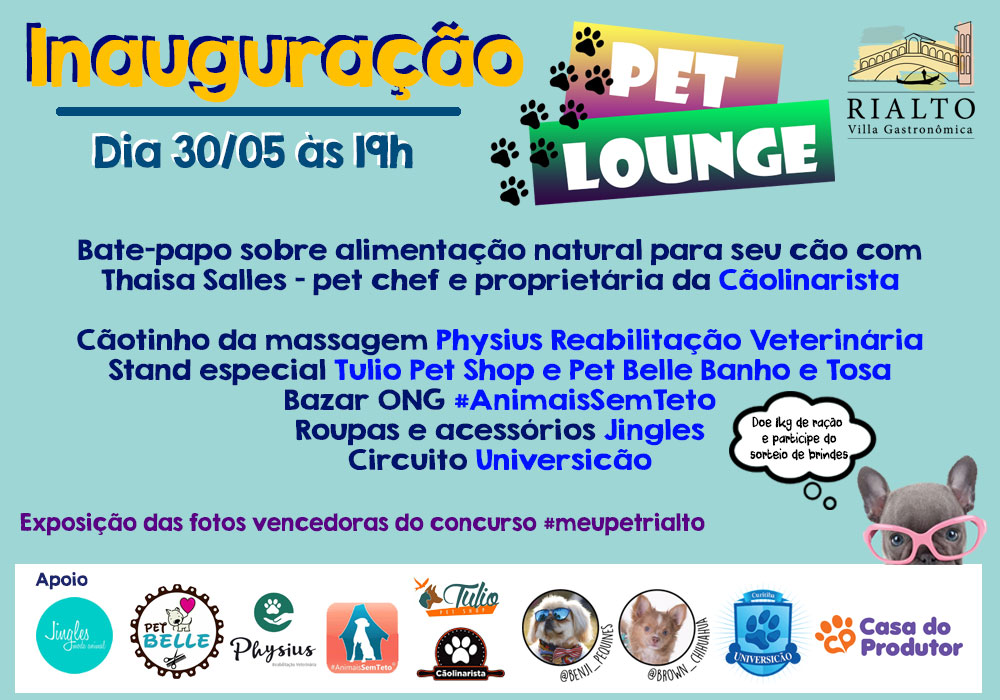Na quinta, dia 30, acontece a inauguração do Pet Lounge Rialto, um espaço criado para que os tutores possam desfrutar da vila junto com seus bichinhos. O lounge foi idealizado para proporcionar conforto e lazer aos pets e ao público em geral. Na inauguração do espaço o público terá um bate-papo com Thaisa Salles, pet chef e proprietária da Cãolinarista, que vai falar sobre alimentação natural para pets. Ainda haverá sorteios, bazar de produtos pet com a ONG #AnimaisSemTeto e a marca de roupas e acessórios Jingles, demonstrações da Universicão e um “cãotinho” da massagem da Physius Reabilitação Veterinária. Além de tudo isso, a inauguração contará com a presença dos dog influencers @benji_pequines e @brown_chihuahua e estarão expostas as fotos vencedoras do concurso #meupetrialto.