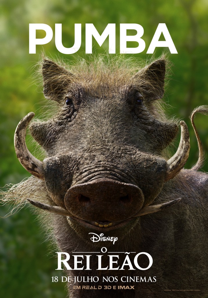 Pra ir alimentando ainda mais a ansiedade dos fãs, a Disney divulgou hoje os pôsteres individuais dos personagens do novo longa. Tudo bem que o Pumba ficou meio que assustador, mas afinal de contas ele é um javali né? Já o Timão dá vontade de levar pra casa (como se antes já não desse, mas né?).