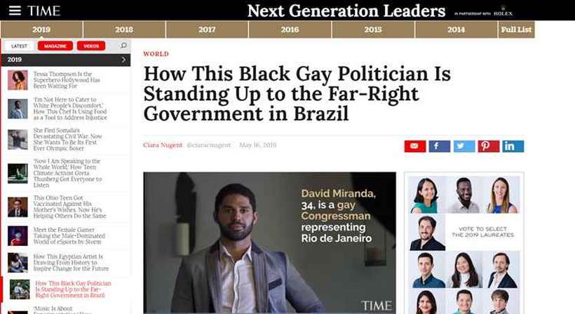 Originário da favela do Jacarezinho, casado com o jornalista americano Glenn Greenwald, Miranda, conhecido pelo ativismo LGBT, diz que fala “pelos que antes não tinham voz” em vídeo publicado no site da revista Time, onde estão resenhados os dez jovens que integram a lista bianual.