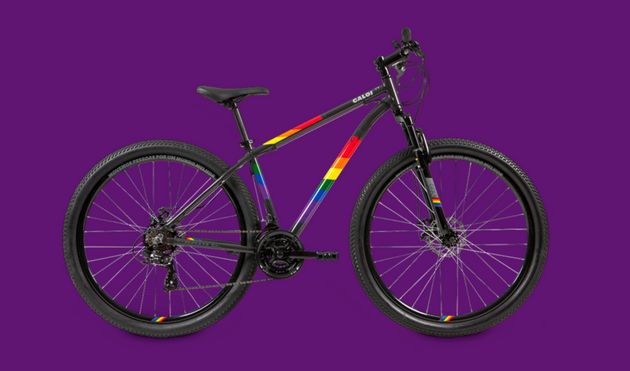 Com grafismo exclusivo que remete às cores da bandeira LGBT, a Rainbow é equipada com freios a disco, quadro de alumínio, suspensão dianteira, câmbio traseiro shimano de 21 velocidades e aro 29 de parede dupla.