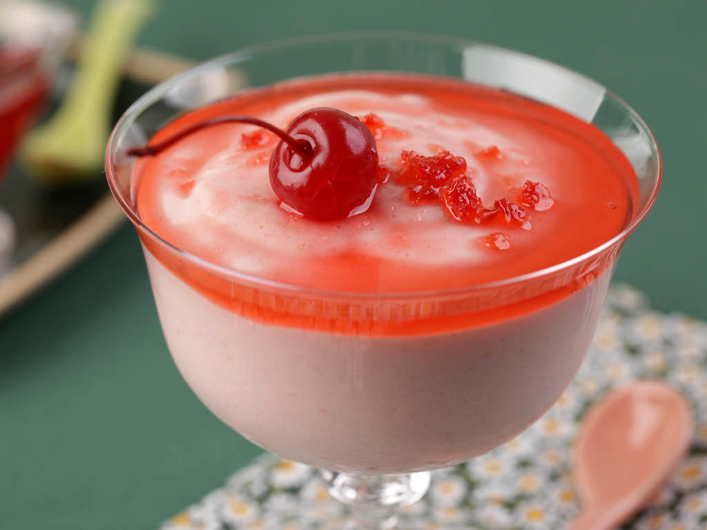 Hidrate a gelatina na água, dissolva-a em banho-maria e adicione-a ainda quente à mistura de cereja e requeijão, batendo rapidamente apenas para misturar. Incorpore essa mistura ao merengue, misturando delicadamente com uma espátula.