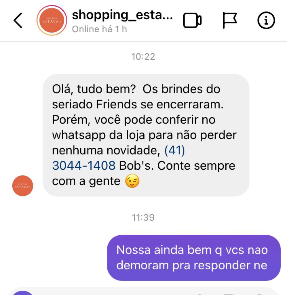 Este whatsapp que o Shopping Estação me enviou como sendo do Bob’s por lá ninguém responde.