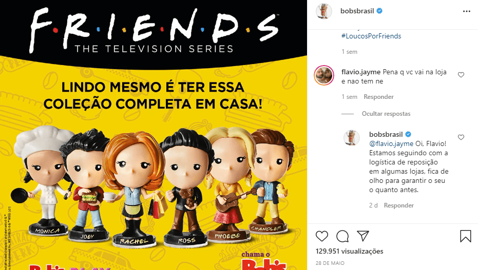O Bob’s esclarece que, ao fechar o licenciamento de uma das séries mais famosas de todos os tempos, planejou o atendimento da maior quantidade de consumidores possível, com 25% de produção maior do que as demais campanhas. Por isso, limitou a compra a 6 combos ‘Friends’ ou 6 toy arts por pessoa no primeiro dia oficial de vendas e trabalhou com logística de reposição em todos os seus pontos de vendas.