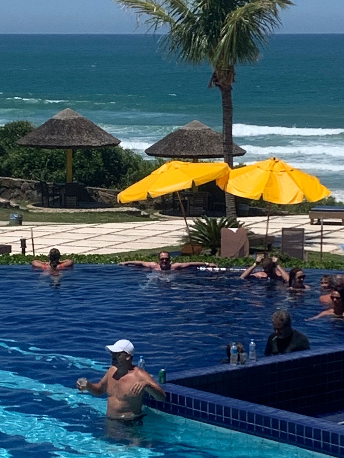 O dia todo vimos muitas cadeiras com bolsas e toalhas e em momento algum conseguimos uma livre. Ao ver uma família levantando perguntei se estavam saindo e ganhei um grosso e sonoro NÃO como resposta. Minutos depois a família saiu da área da piscina (acredito que para almoçar) mas deixou as coisas ali “reservando” as cadeiras.