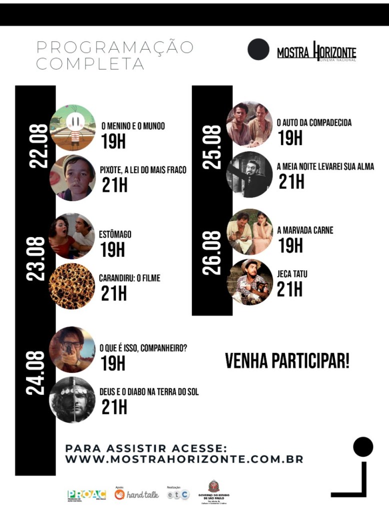 Na próxima segunda-feira, dia 22 de agosto, começa a MOSTRA HORIZONTE CINEMA NACIONAL, evento 100% online e gratuito que apresentará dez clássicos do cinema nacional, a maioria pela primeira vez com recursos de acessibilidade para pessoas com deficiência visual e auditiva.