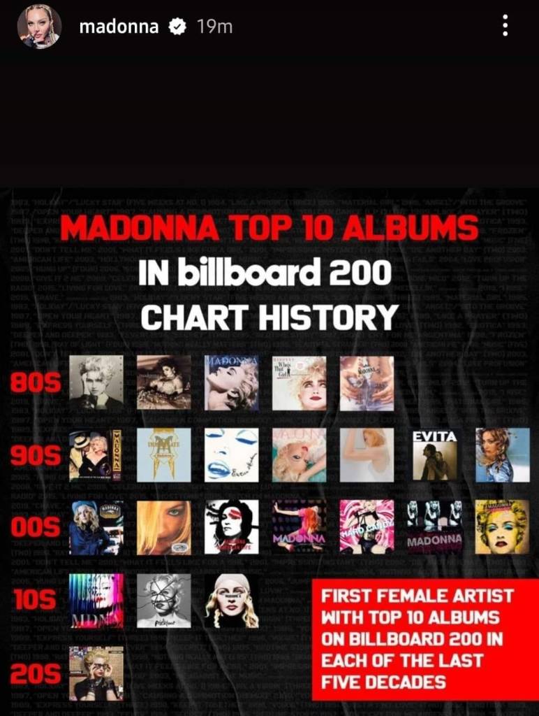 Desde sua estreia em 1983, a cantora lançou 23 álbuns no top 10 durante a carreira, sendo que nove deles chegaram ao número 1. Seu mais recente álbum, Madame X, chegou ao primeiro lugar da lista em 2019.