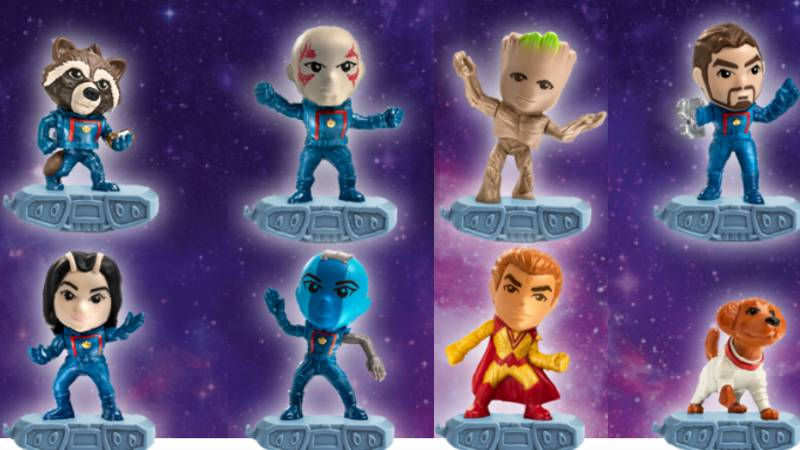 Para celebrar a estreia do terceiro filme da saga dos Guardiões da Galáxia o McDonald’s traz no mês de maio miniaturas dos personagens no McLanche Feliz.